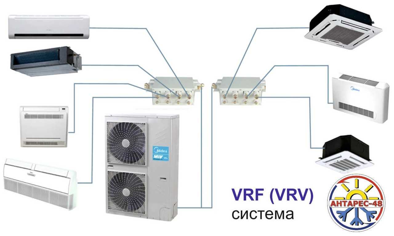 VRF/VRV-система состоит из наружного блока и множества внутренних блоков, соединенных между собой в единую суть. Эта система кондиционирования хорошо зарекомендовала себя в офисах и дорогих жилых комплексах. Она эффективна, функциональна и позволяет регулировать температуру индивидуально в каждом отдельном помещении.